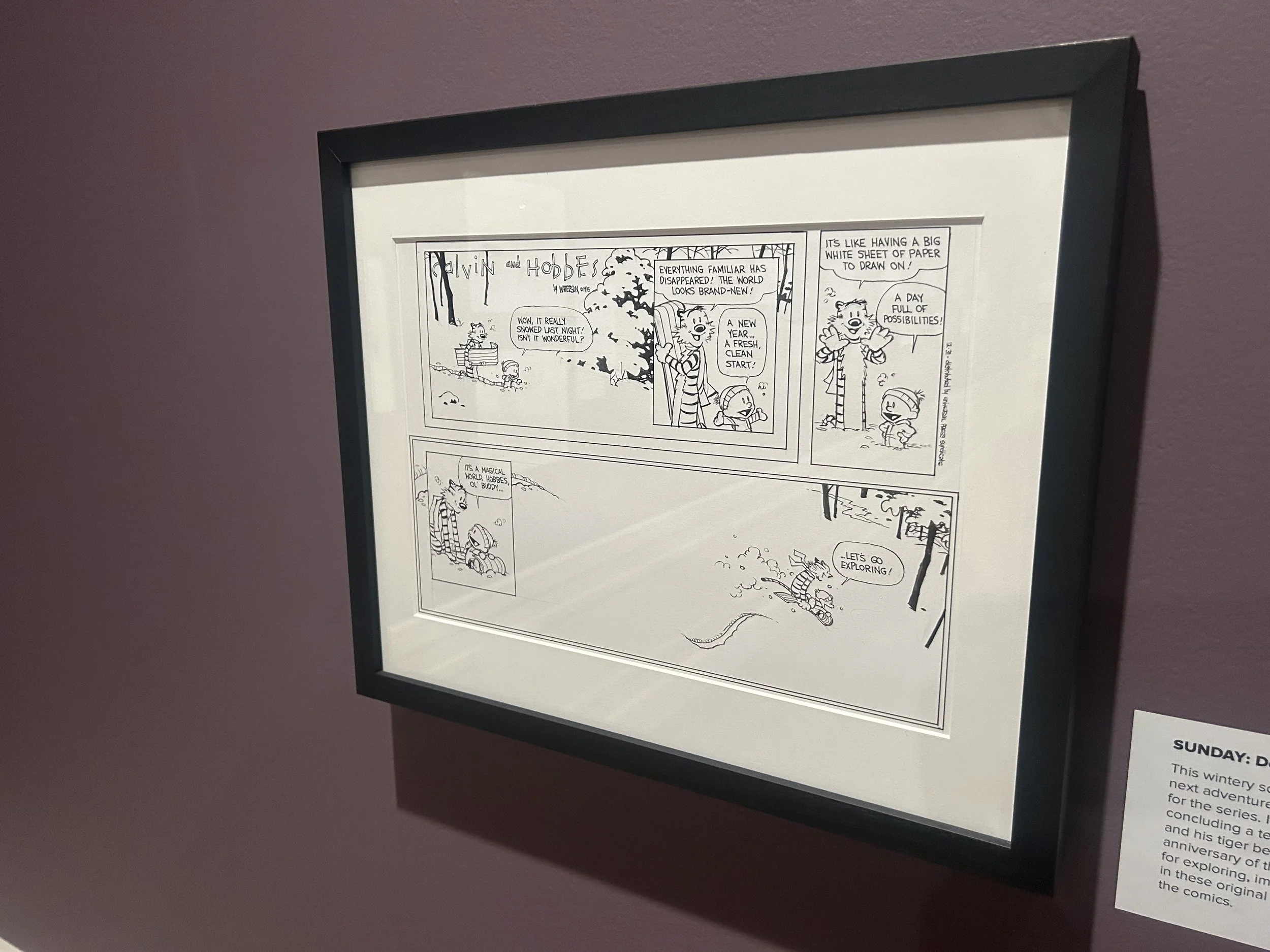 I walked into the Exploring Calvin & Hobbes exhibit at the Fenimore Art Museum on a sleepy, snowy December morning. The weather outside was incidental, but it did add to the mood. My childhood winters were spent either exploring the snow-laden woods around my house or on the sofa, a cup of cocoa in my hand and a copy of The Essential, The Authoritative, or The Indispensable Calvin & Hobbes across my lap.